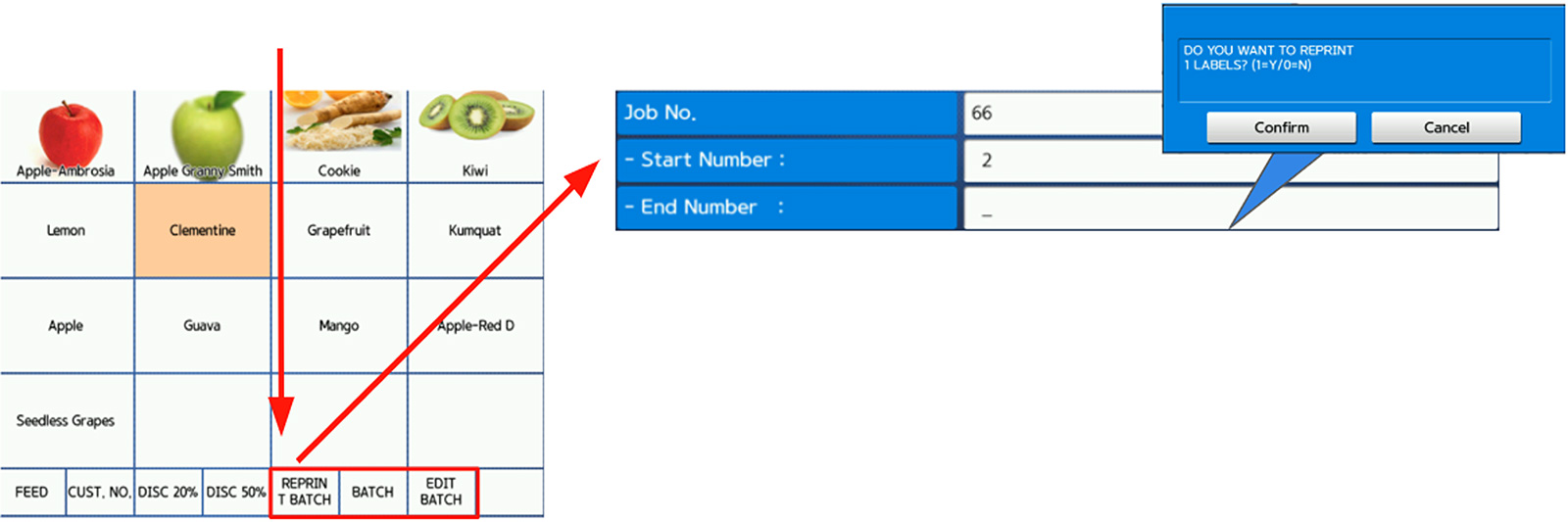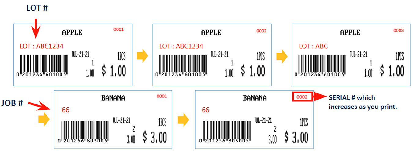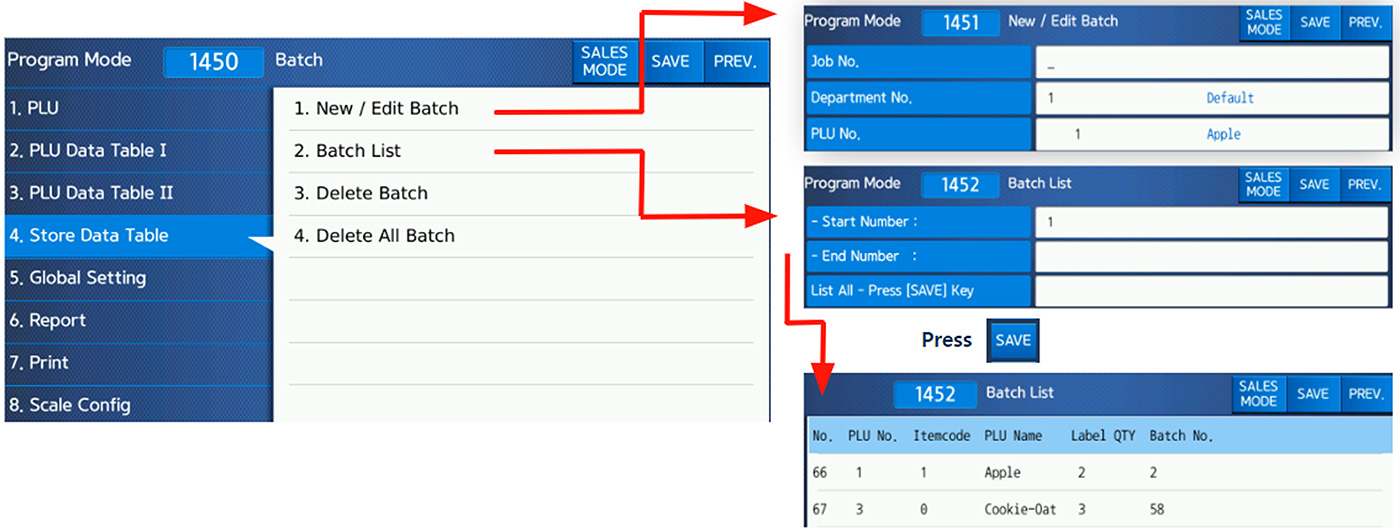 A Batch Job feature has now been added. You can create up to 99 jobs for non-weight and by-count PLU'S to print a specific amount of labels. This includes the Job's # and a Batch #. They can be programmed as Function Keys. You can re-print a specific label from your last batch. They won't be reflected in report numbers, and the serial number will be the same as the original.